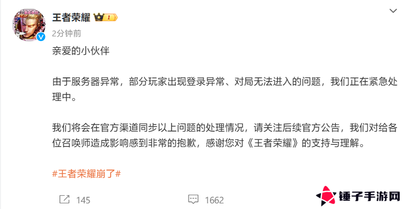【21:40 更新】王者荣耀官微发文回应:由于服务器异常,部分玩家出现登录异常、对局无法进入的问题,我们正在紧急处理中。我们将会在官方渠道同步以上问题的处理情况,请关注后续官方公告,我们对给各位召唤师造成影响感到非常的抱歉,感谢您对《王者荣耀》的支持与理解。