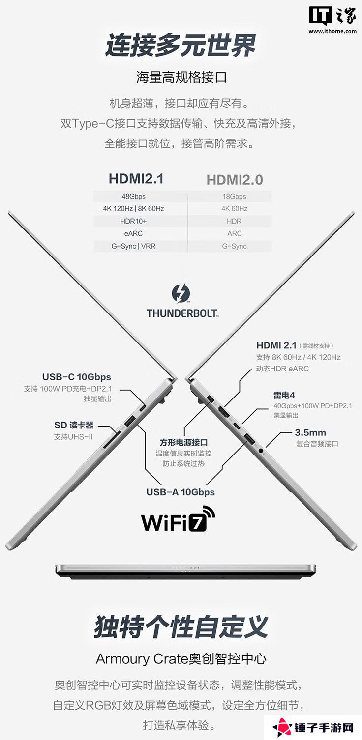 I/O方面,该机左侧配备1个 HDMI 2.1接口、1 个雷电 4 接口、1个 USB-A 10Gbps接口、1个 3.5mm音频接口;右侧配备1个 USB-C 10Gbps接口、1个 USB-A 10Gbps接口、1个 SD卡读卡器。