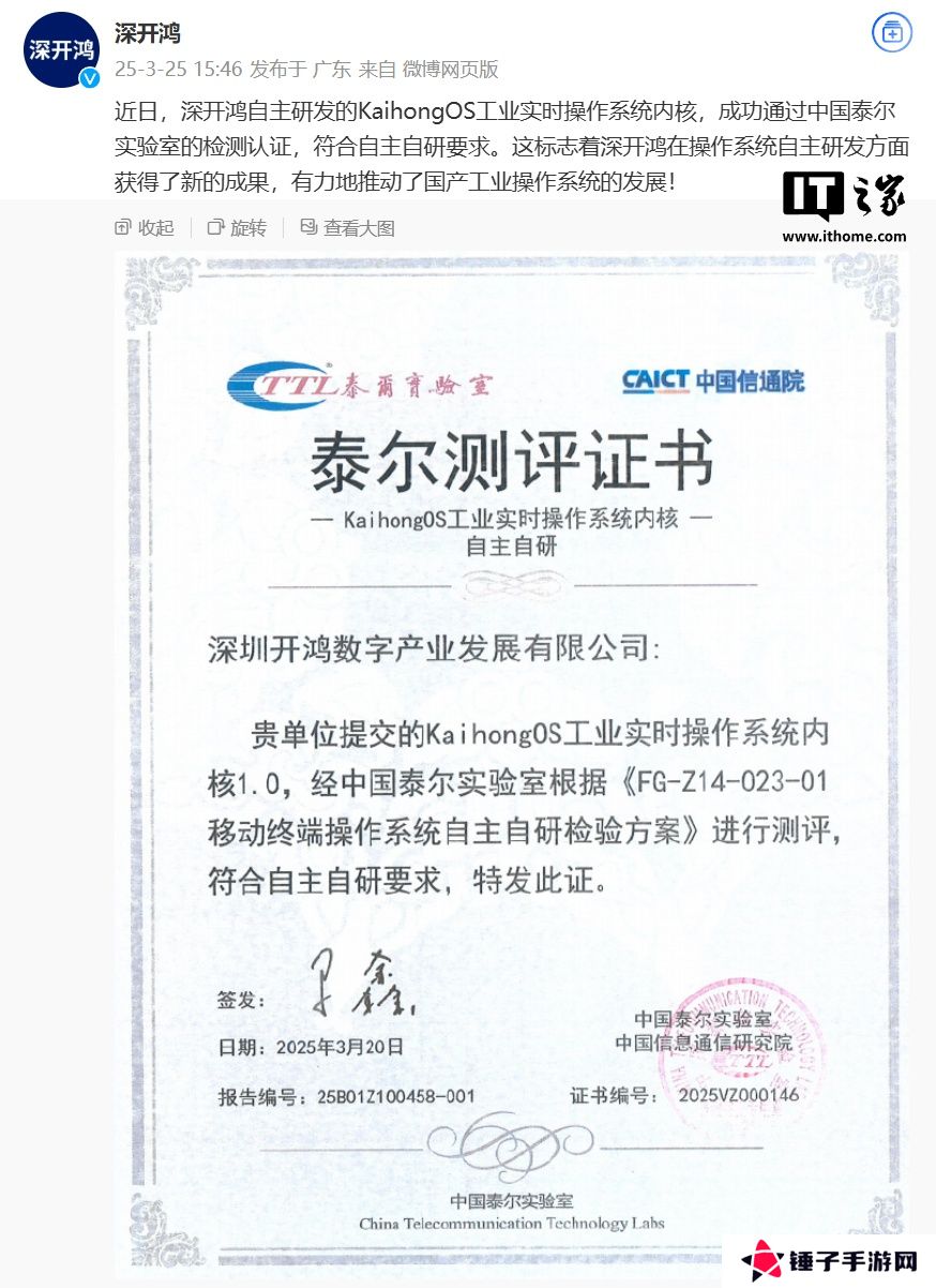 本站 3 月 26 日消息,深圳开鸿数字产业发展有限公司官方微博昨日发文宣布,其自主研发的 KaihongOS 工业实时操作系统内核成功通过中国泰尔实验室的检测认证,符合自主自研要求。