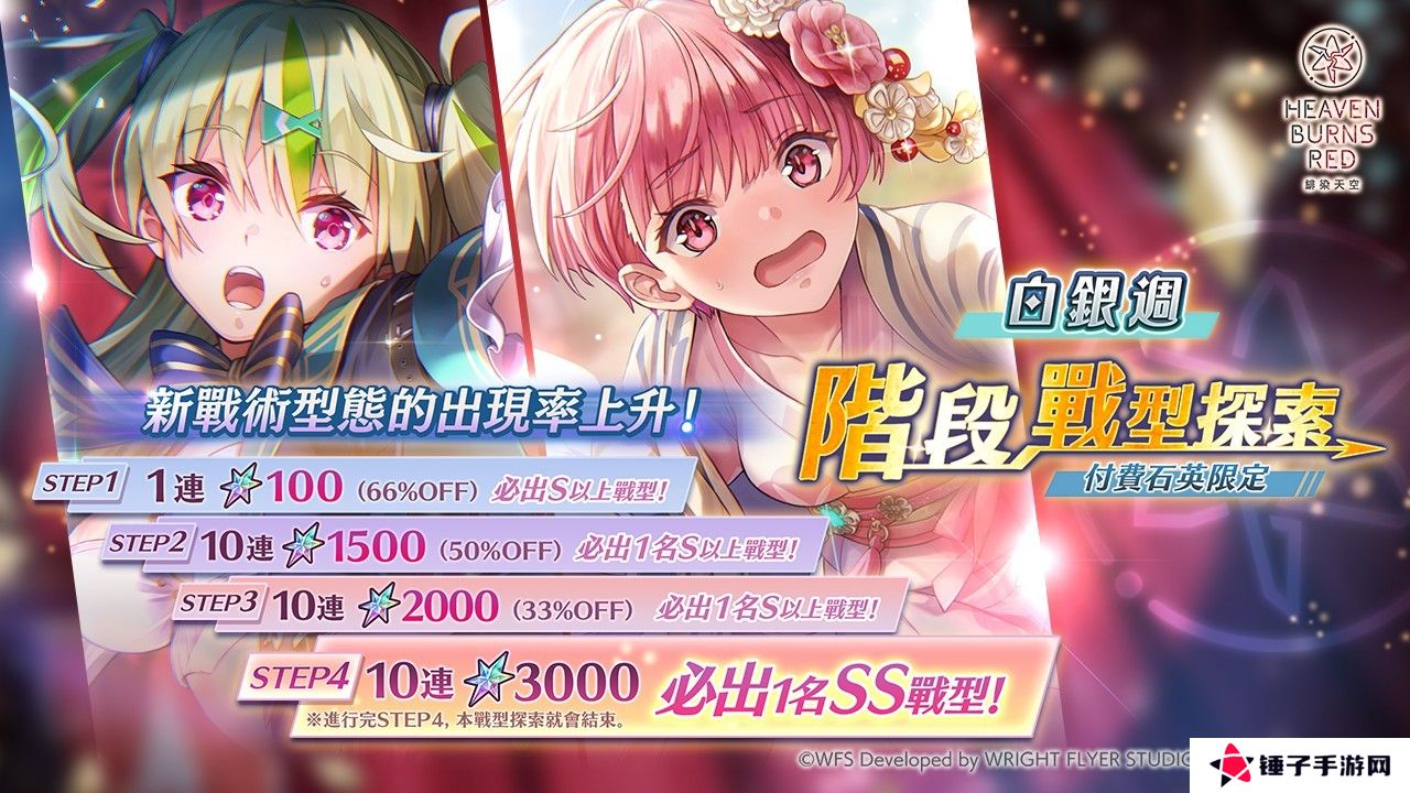 此阶段战型探索为付费石英限定的探索,在 STEP4 的第 10 次必出 SS 战术型态!新战术型态的 SS [Magic of Smile] 大岛五十铃、SS [绚丽华美的花样少女] 大岛三野里经精选出现机率上升!STEP 数最高至 4 为止,进行 STEP4 的探索后,本战型探索将会结束。