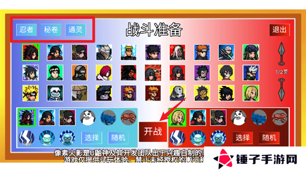 4、在战斗准备界面玩家们点击左上角的选项选择使用的忍者和秘卷通灵,选择完成点击开始。