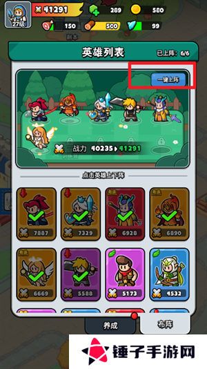 6、玩家们还可以点击右上角的一键上阵进行快速的组合上阵。