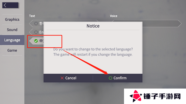 3、在语言选择的界面点击中文,并在弹窗里面点击右下角的按钮就能够设置中文。