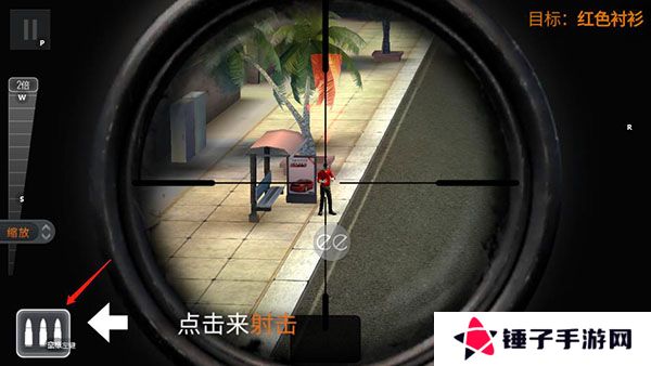4、开镜瞄准后,点击左下角的按键点击进行射击。