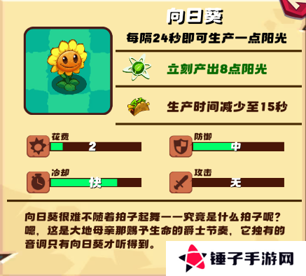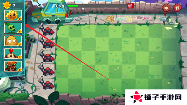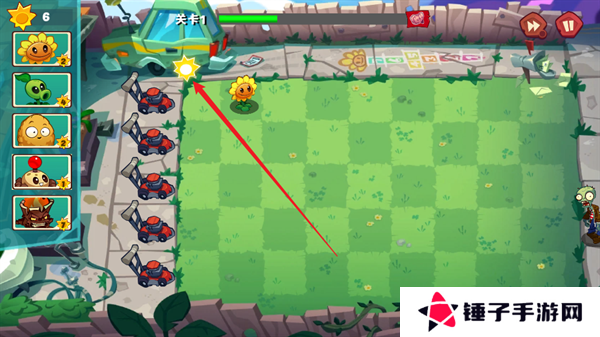 4、在关卡之中你首先需要种植向日葵,它能够产出阳光,来帮助你更好的种植其他植物。