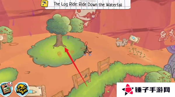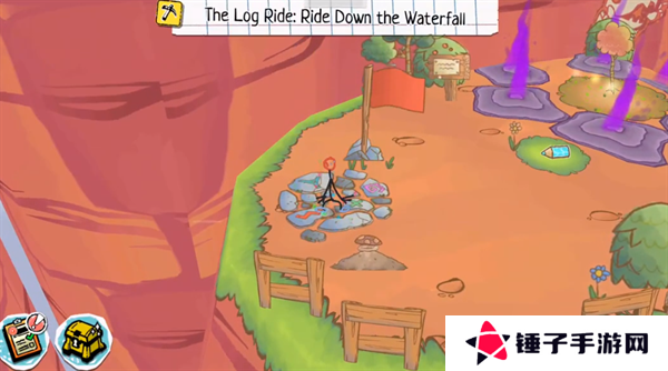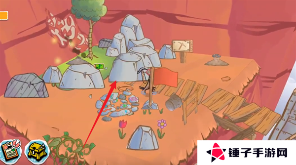 1、玩家们首先需要跟随着剧情来进行冒险,在地图上面拾取带有工具图案的画板,比如在悬崖旁边拾取到镐子的画板。