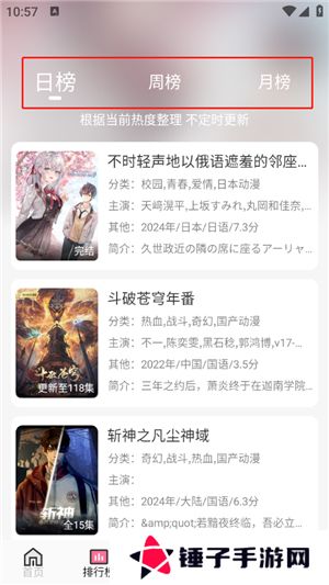 2、“排行榜”页面,有日榜、周榜以及月榜,让用户及时发现当下火爆的动漫资源。