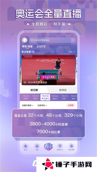 1、奥运会全量直播:覆盖全部 32个大项、48个分项、329个小项,3800-4000小时直播,7000+场比赛,全程精彩,一刻不漏。