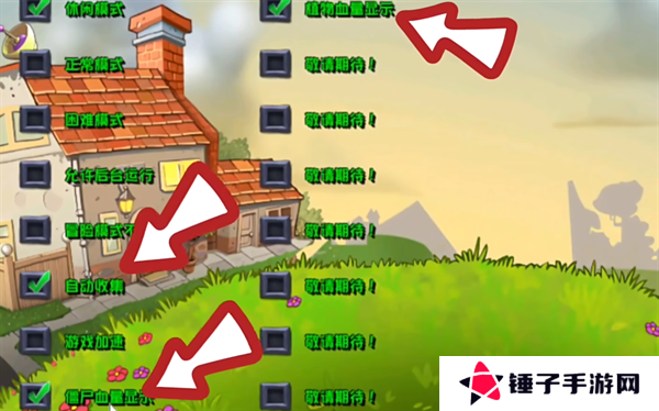 4、除此之外,控制台当中还会存在着一些辅助的功能,自动收集让你不用再关卡攻略的过程之中主动的点击金币战术,更加的省力,僵尸血量显示以及植物血量显示让你能够对战斗的局面获得更好的把握,从而轻松的获取到胜利。