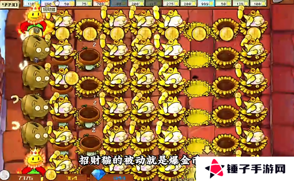 6、此时在自己的花盆上进行招财猫的种植,这种植物的被动就是爆金币,每隔一段时间都回变出九个金币。