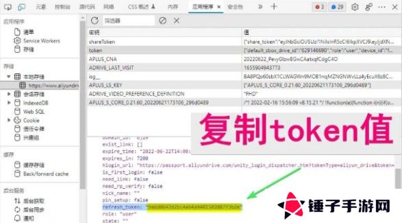3,登录成功之后,按下键盘上的F12键 (或者ctrl + shift +i),打开‘开发人员工具’。然后,依次点开:应用程序(Application)→ 本体存储(Local Storage)→ token。点开 token 之后,找到底下的 reflash_token。在 reflash_token 后面有一串代码,那就是 token 值。