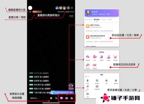 2、开播后可在主播直播界面查看直播相关信息和进行直播相关玩法: