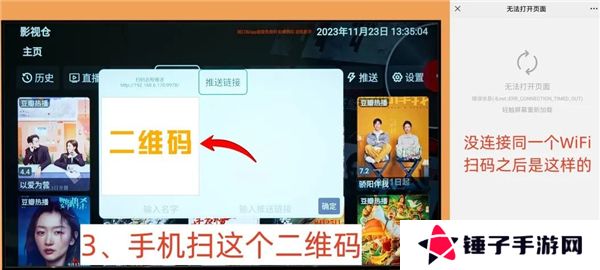 一、创建连接。拿出手机扫码(微信和浏览器的扫一扫都可以),电视和手机需要连接同一个WiFi,不然手机扫码会失败,打不开链接。