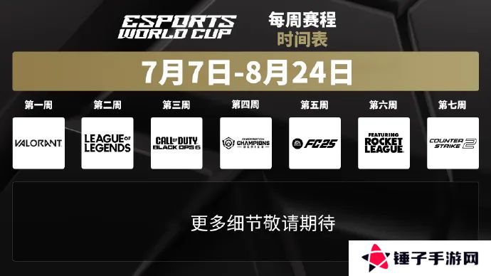 EWC电竞世界杯官方发布2025年七周赛程表,赛事7月7日开赛至8月24日结束,详细赛程如下: