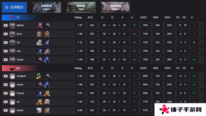 虽然T1全队五人均打出正K-D、1.0+ Rating、220+ ACS和30+击杀的高效稳定发挥表现数据,而NS全队五人均负K-D,但T1两张地图却仅以13-11和13-10的比分惊险胜出。