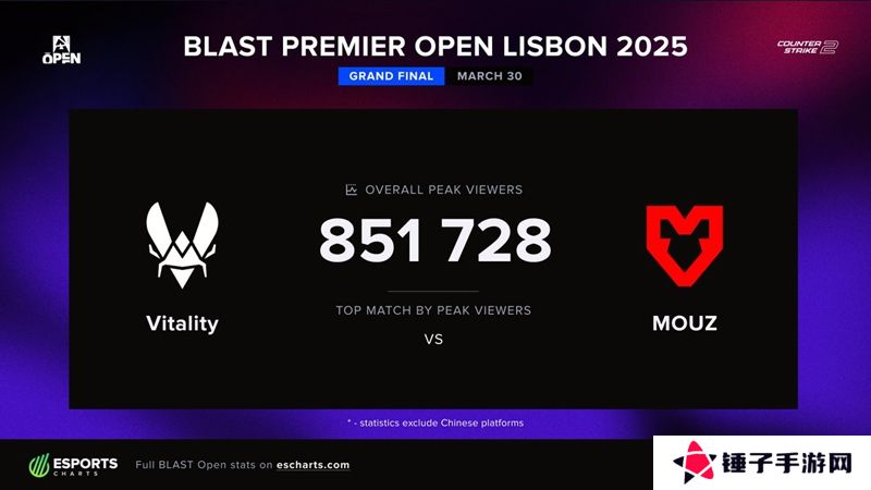 MOUZ战队夺冠,而外媒也分享了本次里斯本决赛的峰值观众人数,达到了851728人。
