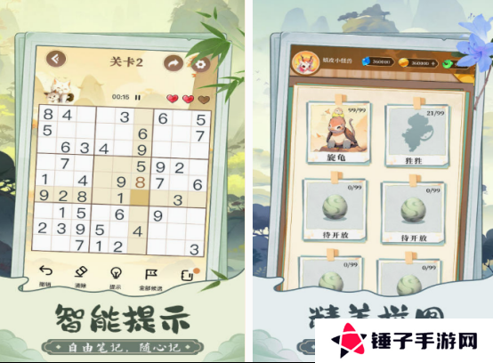 在这款以经典的数独为主进行闯关的游戏中,不仅需要玩家有很好的观察能力以及专注力,更要正确的推理,才能在每次玩的时候完成任务,还将拼图游戏又结合在了一起。相对于设计风格比较简单的,这款由于融入了闯关玩法,所以在玩的时候更加有趣,只有最强大脑,凭借自己的实力才能完成闯关。在拼图玩法中以山海动物为主题,给大家带来独特的画面表现。