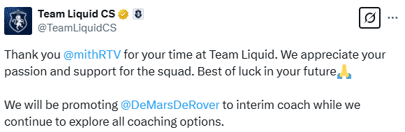 Liquid俱乐部于官推宣布队内教练mithR正式离开,这位丹麦教练九个月的任期画上了句号。