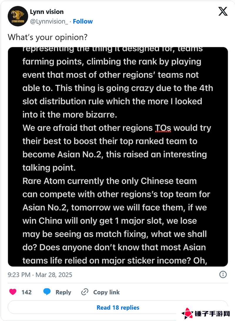 “如果我们赢了,中国就只会获得一个Major赛事名额;如果我们输了,可能会被认为是打假赛。”LVG战队在社交平台上的一条帖子中写道,随后还阐述了贴纸收入对亚洲战队的重要性。