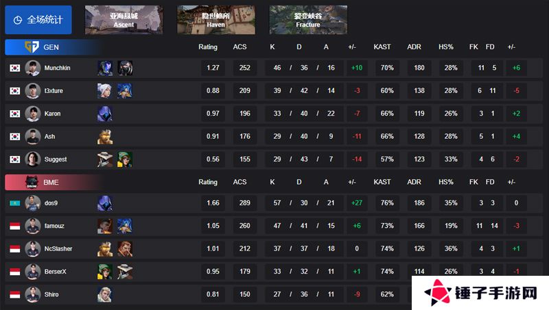 dos9爆砍全场最高的57杀、1.66 Rating和289的ACS,Famouz也打出47杀和260的ACS。Munchkin空砍46杀、1.30 Rating和252的ACS难救主。
