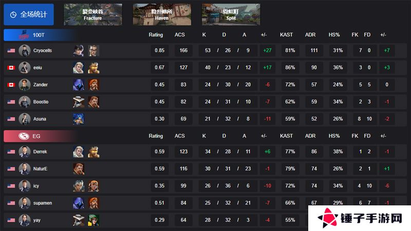 Cryocells轰下全场最高的54杀、344 ACS和1.75 Rating,eeiu也砍下40杀、244 ACS和1.43 Rating,凭借两人的联手发挥,100T直落两图横扫EG,赢下新赛季首场胜利。