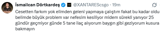 XANTARES:我和其他人没什么不同,已经竭尽全力了,但只能做到这样。我的腰有严重问题,呼吸急促,胃一直灼痛,25天了一直没好转。每天要吃5种药,像行尸走肉一样活着...真的很抱歉。