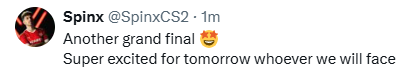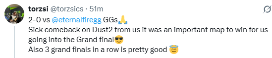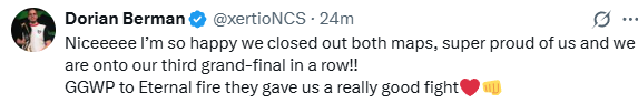 xertioN:Niceeeee!太开心了我们拿下了两张图,为团队感到超骄傲!我们连续第三次杀进总决赛了!!