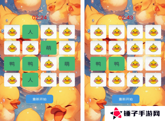 此游戏是以各种可爱的小黄鸭进行消除的游戏,由于里面小黄鸭的设计风格非常的独特,所以本身的游戏画面,就能吸引很多玩家的喜欢。需要你在玩的时候,仔细的观察里边的小黄鸭,通过记住他们所在的位置,每次翻开两张小黄鸭卡牌,进行匹配就能完成消除。并不是简单的点击屏幕,就可以完成消除的,所以老年人在玩的时候,更锻炼大脑。