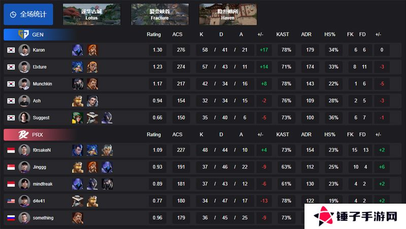 图一GEN选择莲华古城,Karon的幽影表现出色砍下24杀和287 ACS,GEN上下半场攻守俱佳、稳扎稳打,以13-10先下一城。foraskeN空砍21杀。