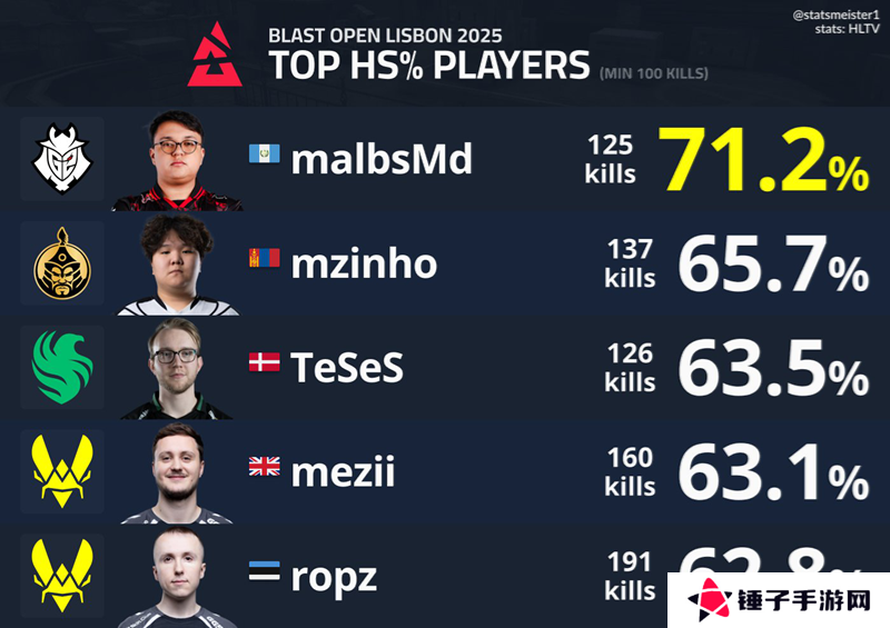 本次赛事的爆头王是malbsMd,他有71.2%的爆头率,而第二名是mzinho,为65.7%,第三名是TeSeS,为63.5%。