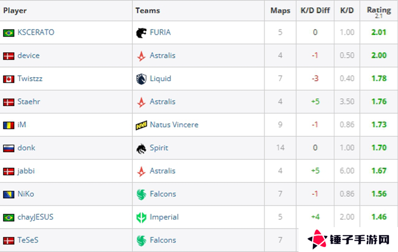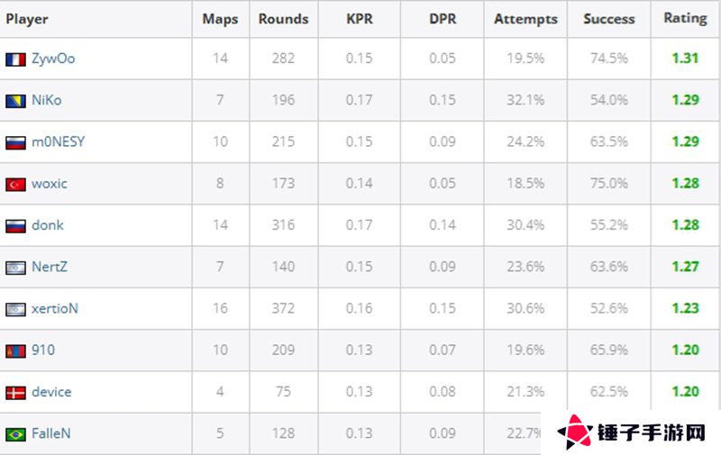 第一名是donk,他在14张地图上有着1.48的rating,同时他有着100的火力值。第二名是赛事MVP ZywOo,他在14图有着1.44的rating。第三名是sh1ro,14图有着1.29的rating。