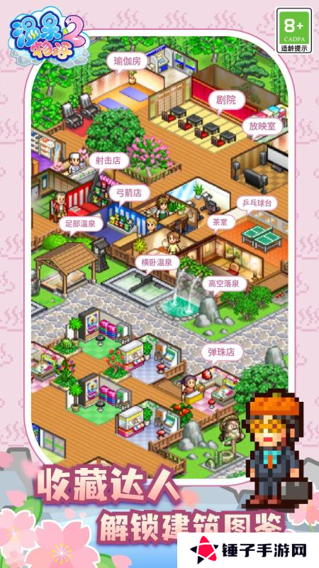 一款像素风模拟经营游戏,玩家将亲手打造一处远近闻名的温泉旅馆。从客房布置到设施规划,温泉池的布局、寿司店的选址,甚至是庭院中绽放的樱花,都会影响客人的入住体验。按摩浴缸、冷水浴、日式料理店,各种设施与美食等待解锁,让度假村更加丰富多彩。四季更替,风景变幻,旅馆在岁月流转中逐渐成长。而形形**的客人也带着奇妙的需求前来,等待你的巧妙安排。
