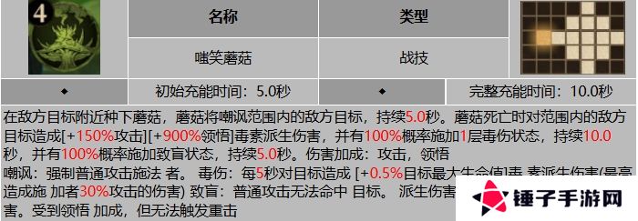 这个蘑菇具有嘲讽功能,能够吸引范围内敌方目标的注意力,使其强制对蘑菇进行普通攻击,持续时间为5秒,当蘑菇死亡时,还会对范围内的敌方目标造成提升150%攻击以及增加到900%领悟]的毒素派生伤害,不仅如此还会直接带来毒伤的影响施加,而且大家不用担心这个效果不生效,因为生效几率是百分百的,且有比较长的10秒可以利用。