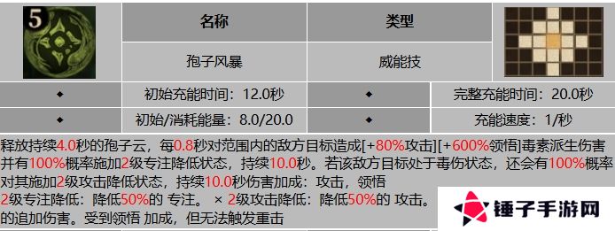 当释放这个技能时,会形成一片持续4秒的孢子云,在孢子云范围内,每0.8秒就会对敌方目标造成+80%攻击以及+600%领悟的毒素派生伤害,并且有100%的概率施加2级专注降低状态,持续10秒,如果此时该敌方目标正处于毒伤状态,还会有100%的概率对其施加2级攻击降低状态,同样持续10秒,这里的2级专注降低状态会降低敌方目标50%的专注,而2级攻击降低状态则会降低敌方目标50%的攻击。